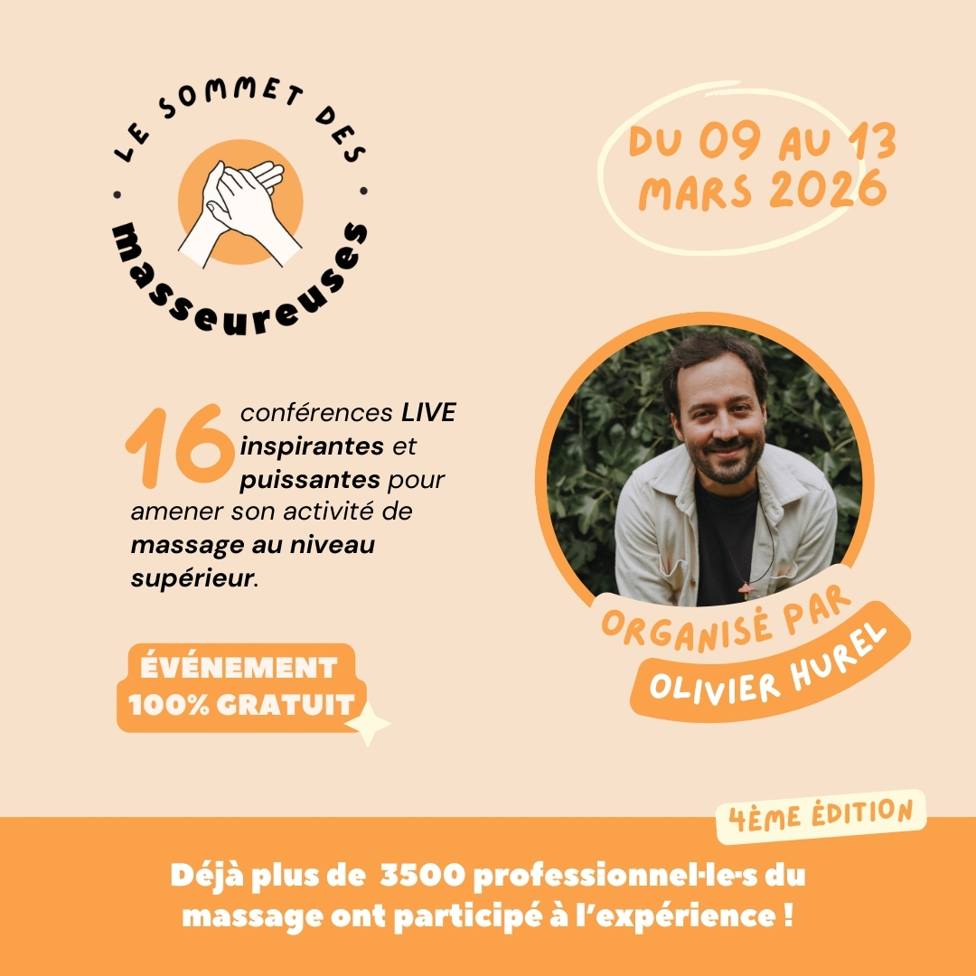 C’est un événement totalement gratuit, ne passe pas à côté de ce cadeau ! Tu peux bien évidemment partager ce lien avec tous tes amis entrepreneur·euse·s du massage bien-être qui pourront également nous rejoindre.
